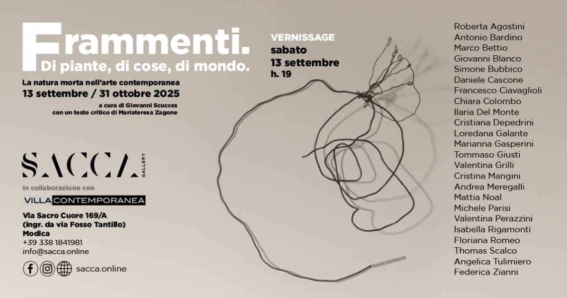 Un dialogo tra due gallerie, due territori (nord e sud) e tre personalità che credono nella forza delle relazioni. In questo modo giunge a Modica la mostra “Frammenti. Di piante, di cose, di mondo” che sarà inaugurata sabato 13 settembre alle ore 19 presso la Galleria SACCA. Curata da Giovanni Scucces, con un testo critico di Mariateresa Zagone e in collaborazione con la Galleria Villa Contemporanea di Monza, vedrà protagonisti 24 artisti fra giovani e mid-career.
